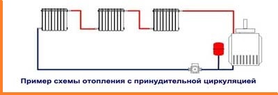 Для схемы отопления частного дома с принудительной циркуляцией, в отопительной системе необходимо установить циркуляционный насос. Он обеспечивает движение прогретой жидкости по трубам к радиаторам. В данном случае никакого наклона магистралей не требуется. Когда в системе установлены радиаторы, на них необходимо установить краны Маевского для вытеснения воздуха. Охлажденный теплоноситель по обратному контуру подается обратно в котельную.